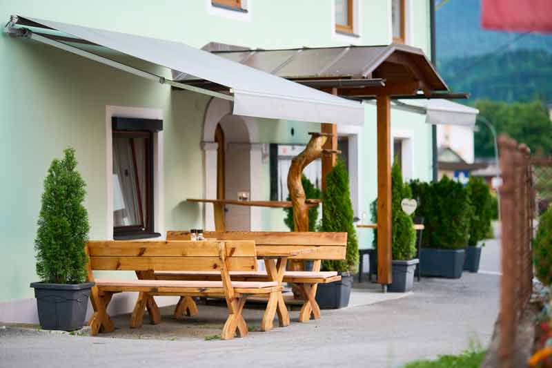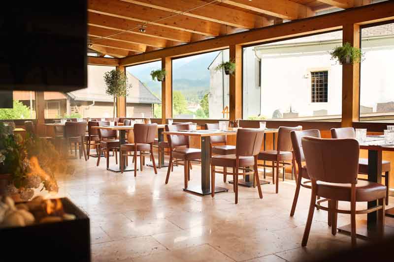 Draußen erwartet dich unsere überdachte Sitzterrasse – von April bis Oktober genießt du hier einen traumhaften Blick auf die Karawanken und die Burgarena Altfinkenstein. Die Atmosphäre wird durch das sanfte Glockenspiel der benachbarten Pfarrkirche St. Stefan noch idyllischer. Dank mobiler Seitenfenster bleibt es selbst bei Regen oder kühleren Temperaturen gemütlich – deshalb gilt hier auch ein striktes Rauchverbot.